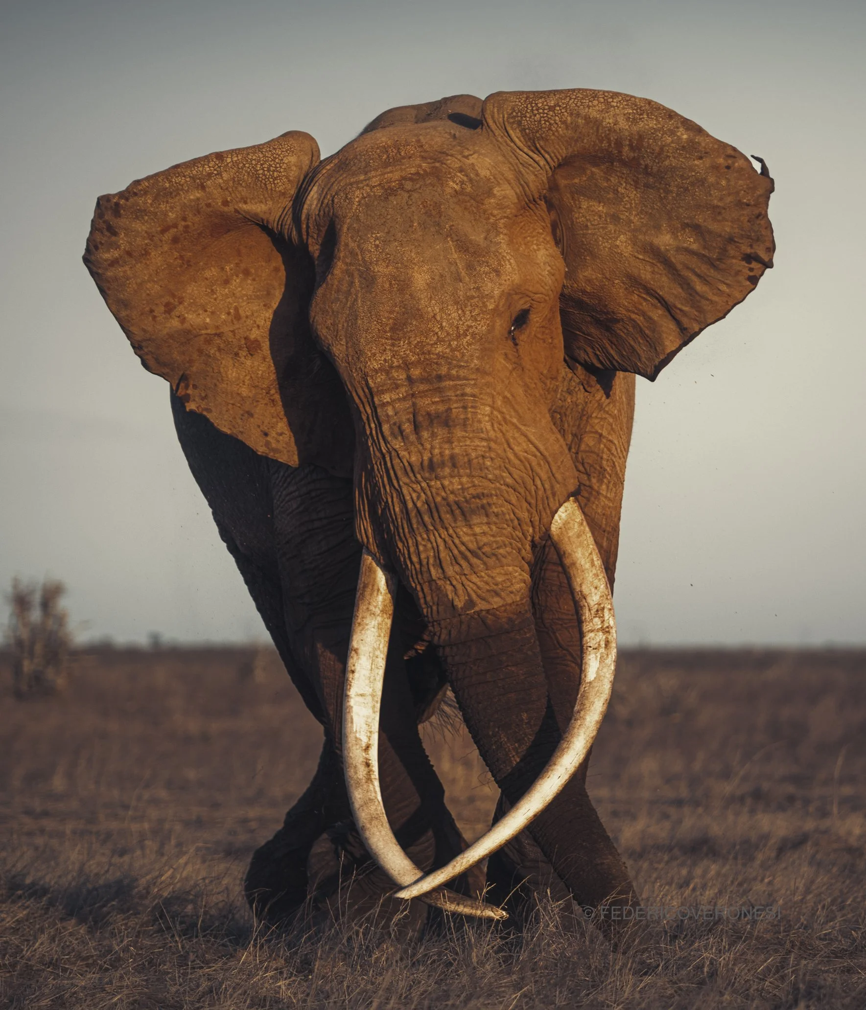 A young emerging tusker, probably born between 1990 and 1995 with stunning tusks crossing at the front. He is quite shy and nervous near vehicles.